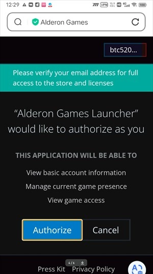 3、点击注册后,他会让你进行邮箱确认,我们点蓝色按钮"Authorize"确认就行了,点击蓝色按钮后,就可以进入游戏输入你的邮箱跟密码登录了!