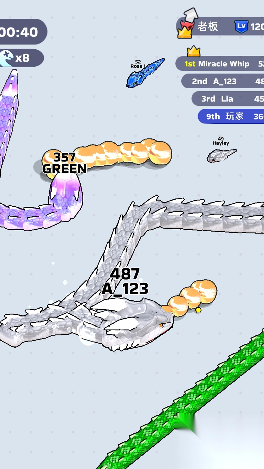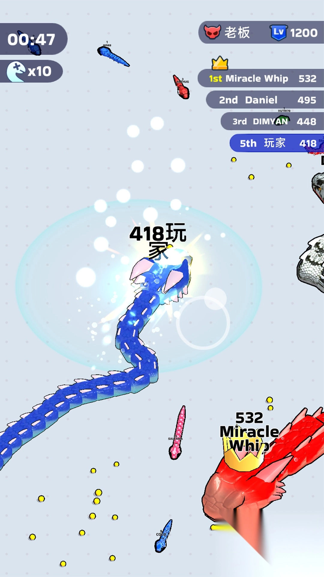 2.当体型足够大时,可主动撞击其他玩家的小蛇头部将其淘汰;同时需灵活走位,避免被对手“绕圈”围困。
