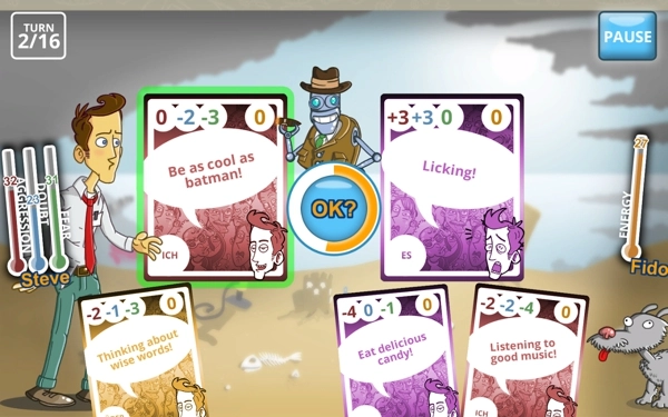 在游戏里,史蒂夫要应对来自日常生活的诸多挑战,这些挑战分别来自母亲、女友、社会青年、老板,甚至还有他内心的恐惧。而机器人弗洛德会为史蒂夫进行心理剖析,教导他克服怀疑、恐惧之类的消极心理状态,去应对100多个恶劣的氛围场景,从而让弱小的自己重新找回信心。