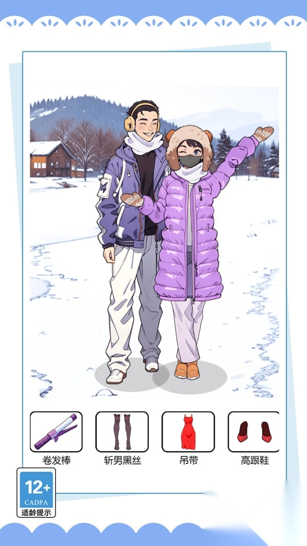3、冬日场景,给人物换装、改造,按提示选物品搭配,完成造型或任务,解锁新关。