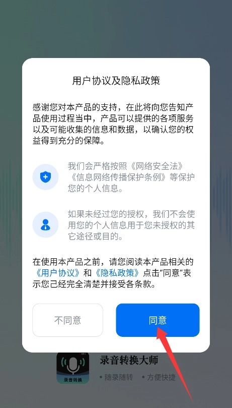 1. 初次使用小恶魔变声器APP,系统会提示阅读用户协议与隐私政策,点击同意按钮方可进入。