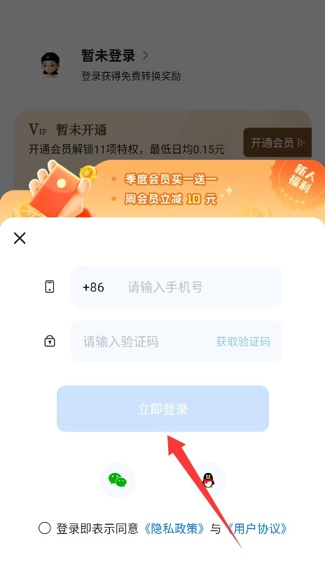 3、填写手机号码并获取验证码,阅读并勾选用户协议后,确认无误后点击立即登录即可。