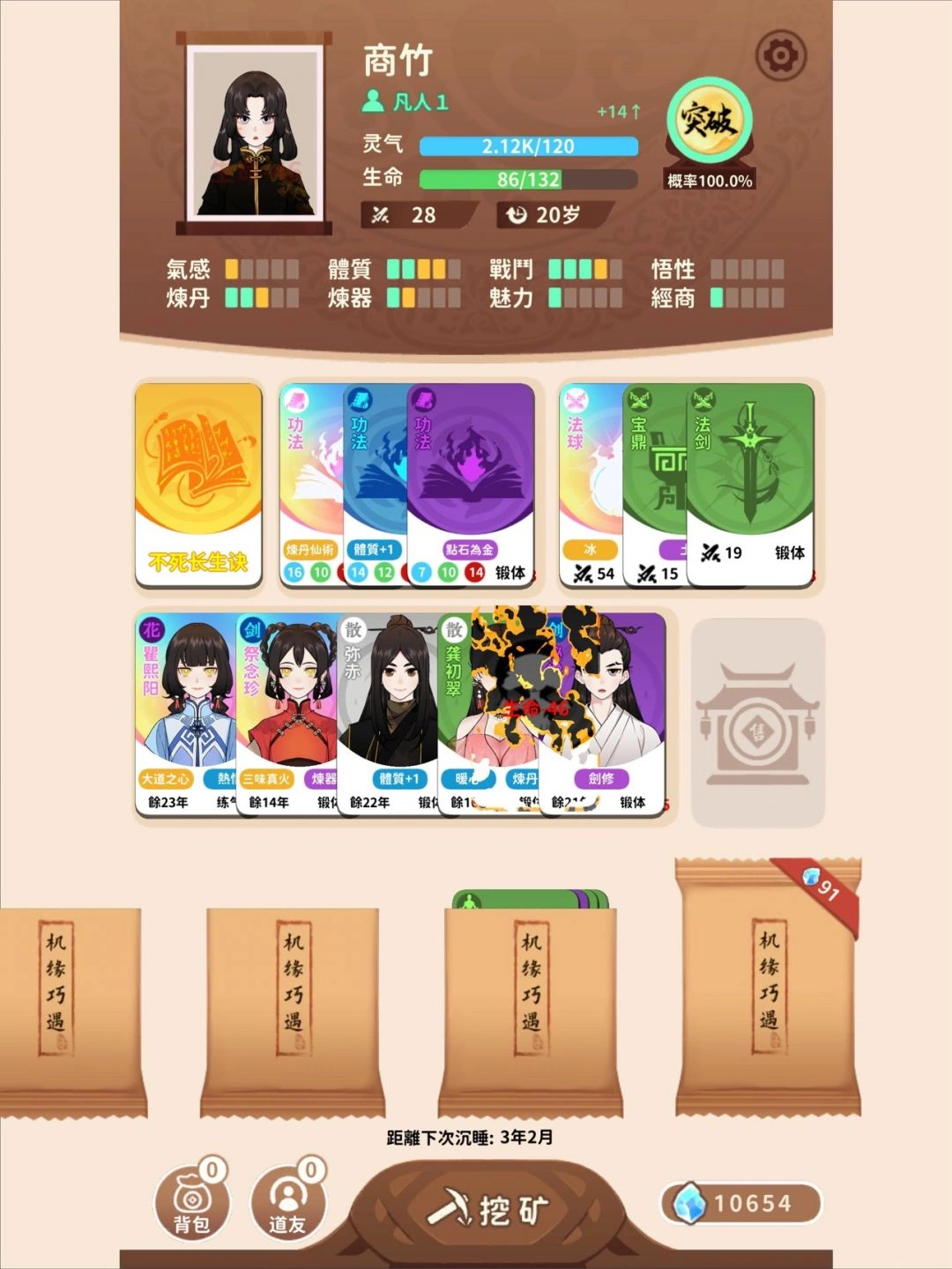 不用开卡包,直接开始挖矿,直到你的灵石有个几千的,刷宝阁盛会,前期找锻体神术接着就是一直刷,突破概率不够就买突破丹[优化:大恢复术(可用恢复术代替)+枯木逢春可以弥补休眠时的空白期]