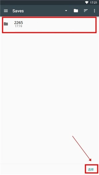 注意:文件查找到这里就可以停止了,在进入【Saves】后就可以点击下方的选择了。这里出现的【2265】文件是我们刚才第一个步骤建立的游戏存档,我们不需要进入游戏存档中,进入游戏存档中再点选择是无效的。