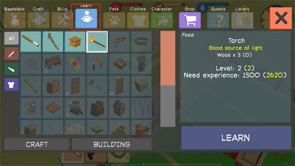 7. 在制造界面,点击 “Learn” 以解锁更多高级道具的制作方法。