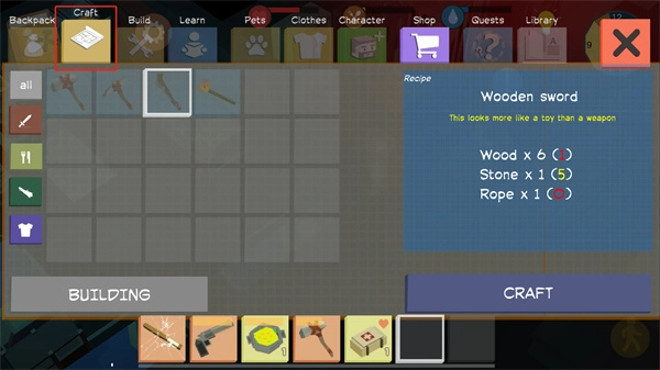 8. 收集足够的材料后,点击 “Craft” 制作所需物品,提升生存能力。