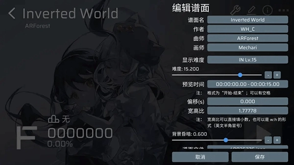 点击铅笔图标,屏幕右边出现谱面设置界面,这里可以调节谱面定数,宽高比和Tip等,请自行调节(记得保存)