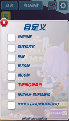 2、与此同时,你能够依据自身的需求,在自定义选项里展开不同的设置。这里不仅支持使用呈正比例的东海帝王形象来进行跑酷,而且还能勾选勾式背景音乐来开启游戏。
