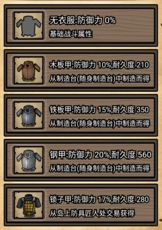 10、无衣服、木板甲、铁板甲、钢甲、锁子甲;