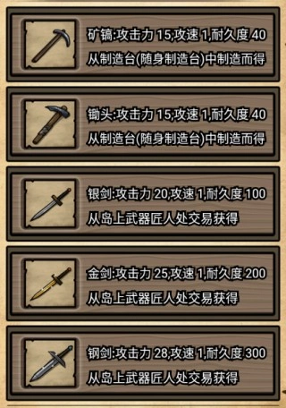 9、矿镐、锄头、银剑、金剑、钢剑;