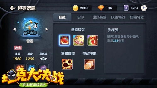 在选择坦克界面的左下角有着交流界面,中下方则是你坦克的定位和各项属性,点击技能介绍可以看到你所有技能,而最右方则是你的勋章,点击小图标便可以看到你所装备的勋章带来的属性提升。
