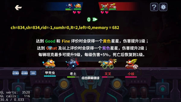 在《坦克大决战》里,老铁们射击命中敌人时,角度越高,伤害越高,评价也就越好。评价从高到低共分五个等级,依次是:Perfect、Wonderful、Great、Fine、Good 。达成不同评价,能永久提升坦克伤害,每级提升5%,最多可提升9级。不过,所有老铁们要留意,如果本回合死亡,伤害就会恢复到1级。评价处于Good和Fine之间,能收获黄色星星,提升一级伤害;评价在Great及以上,可获得紫色星星,提高二级伤害。所以在游戏中,各位老铁得尽量打出高评价,提升自身伤害。另外要注意,坦克死亡时,怒气值会减半!减半!减半!重要的事情说三遍!