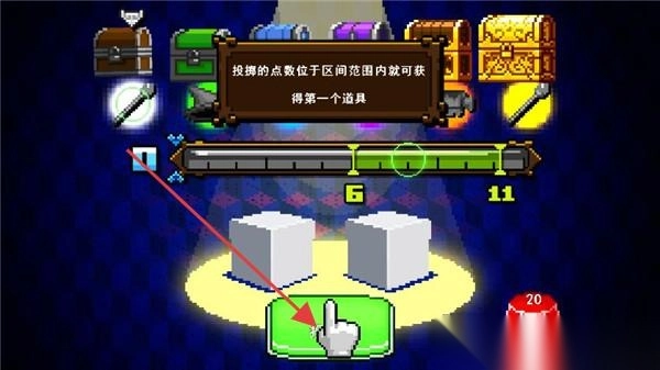2、道具获取界面,通过投掷点数获取道具,有宝箱、武器等展示,点击绿色按钮进行投掷,考验运气与策略。