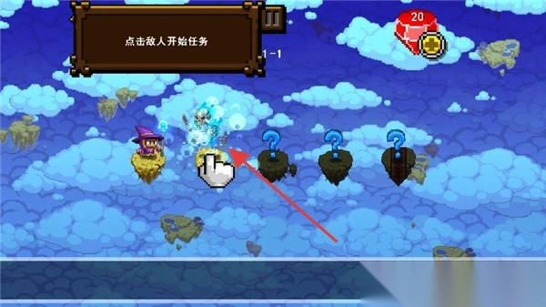 1在关卡选择界面中,清晰显示着“点击敌人开始任务”的提示。界面里呈现出角色(魔法师)以及敌人岛屿的元素,玩家能够通过选择关卡来推动冒险进程。此外,在界面的右上角设有道具入口。