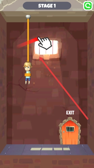 2、于STAGE - 1关卡,依照箭头的指示,在绳索相应位置,通过滑动屏幕切断绳索,让角色借助惯性朝着出口方向移动。