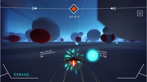 3、操控箭头指向的飞船,通过滑动按键,躲避障碍与收集道具,提升倍数,延长飞行距离,冲击高分。