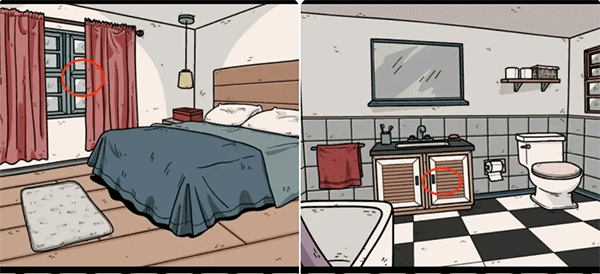 1、卡丽莎视角,先观察卧室窗户上的符号(房子各个场景窗户上有类似符号)后面会用到,四处搜索在二楼卫生间的柜子里找到一只收集要素。