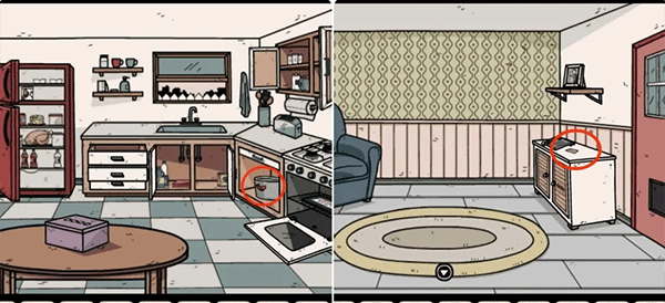8进入厨房寻找道具,可以找到烧鸡、火柴和皮皮虾。在灶台下方的两个柜子里,还能发现第三个收藏品以及饼干的提示(饼干的图案和顺序)。