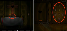到小丑房后面的房间将红宝石放在右侧浮雕的眼睛中,接着进入最里面的房间根据墓碑(符号)以及纸条(数字)上的提示打开铁门。