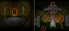 回到走廊最右侧将收集到的蜡烛和宝石放在烛台和十字架上,拿到钥匙后用其打开旁边的门进入后院完成两座墓碑上的拼图,接着拿走左侧出现的玩具钥匙,再将戒指戴在右边的手指获得第三张画像碎片。
