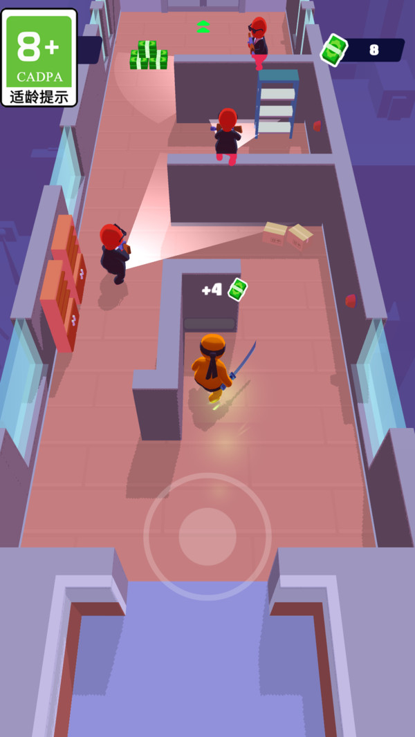 3. 游戏界面左下角设有虚拟摇杆,用于控制角色的移动。玩家可以通过拖动摇杆来改变角色的方向,同时要小心躲避敌人的视线,并寻找最合适的攻击路径。