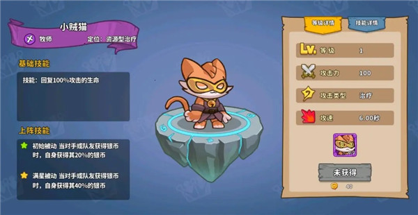 作为资源型治疗的小贼猫,当队友或对手获得银币时,它能够获取其中20%(满星状态下为40%)的银币。