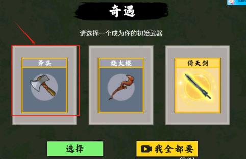 3、从斧头烧火棍倚天剑选个初始武器,点选择或直接点我全都要。
