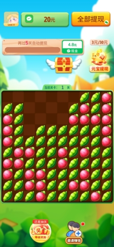 农场点点消是一款可以通过消除闯关来赚取现金红包奖励的小游戏,让玩家在享受畅快消除乐趣的同时获得收益。