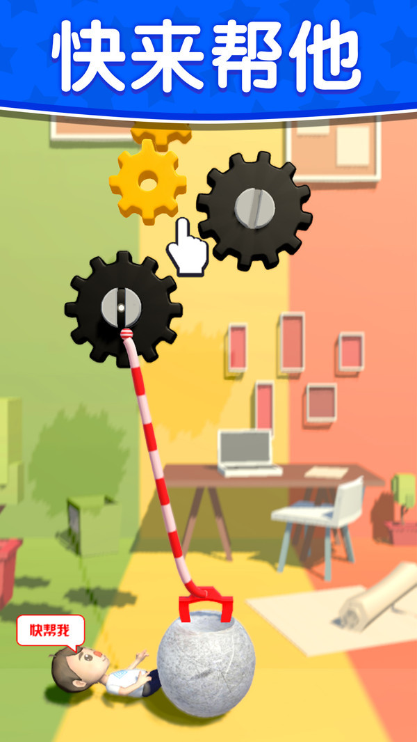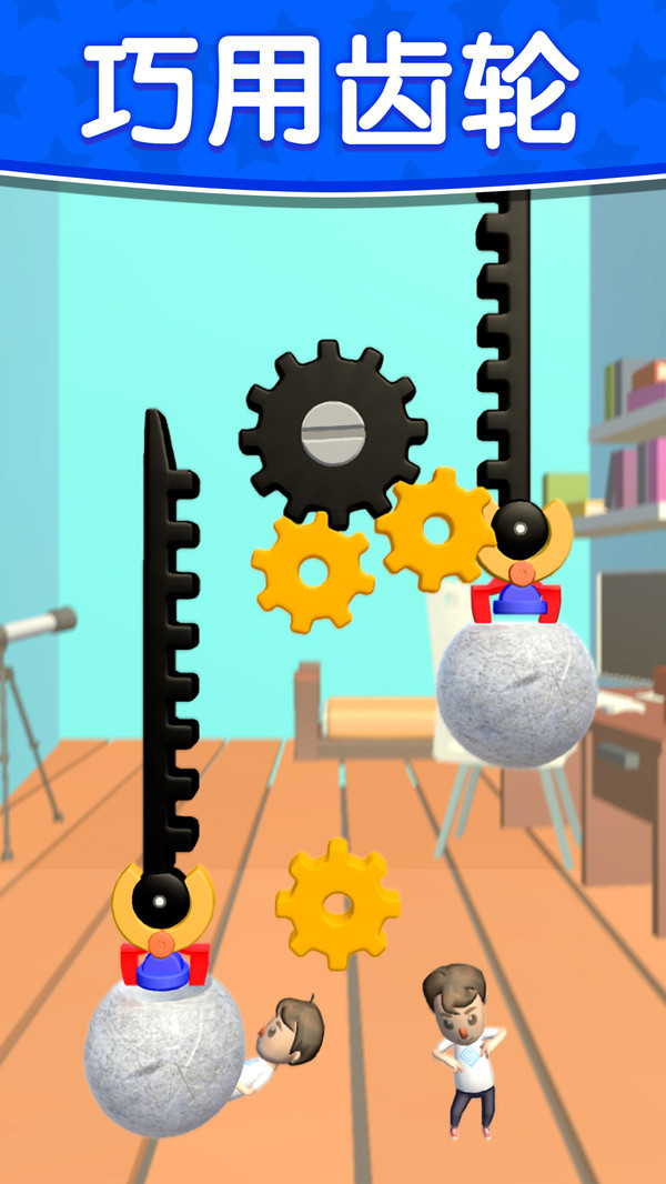 在游戏里,宝宝被巨石困住啦!请仔细观察,开动你的脑筋,借助齿轮或者杠杆来拯救宝宝哦。