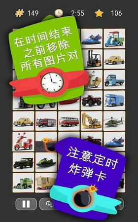 在胡闹连一连游戏中,玩家只需把两个相同的食物连接起来就能实现消除,最多可连三条线。这款游戏极具解压休闲特性,而且设有游戏时间限制,玩家需在规定时间内完成。你取得的成就越多,开启的宝箱奖励就越丰厚,游戏具备一定挑战性难度。游戏里还能收藏可爱的动物、美味的水果、有趣的职业、令人兴奋的表情等等,玩家可尽情享受指尖消除带来的快乐,体验各种不同的游戏模式。