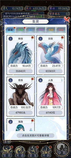 3、大家需要不断培育各种各样的生灵,并且各个种族的都要培育,让世界变得更加和谐和平衡。