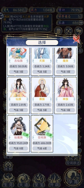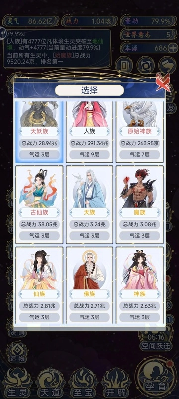 5.本源:优先选择选择开辟之中的产生灵气的选项;其次,选择减少种族晋升时间的选项;最后选择晋升种族的选项。(注:本源尽量保持在30点左右,以应对突发事件。一个恩赐就需要消耗20点本源,其余事件最少消耗0点。)