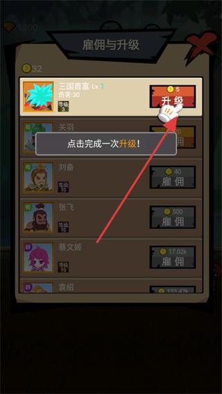 3、在“雇佣与升级”界面,不仅能够对已有的雇佣进行升级,通过花费金币来提升战力,而且还可以雇佣新角色,进一步强化队伍,充分展现出放置游戏的养成核心。