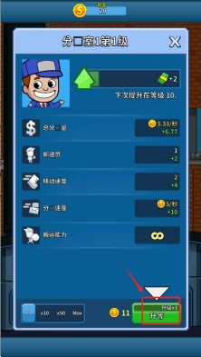 3、点击 “升级” 按钮,花费 11 金币,提升分口室等级,增加每秒收益,助力游戏进程。