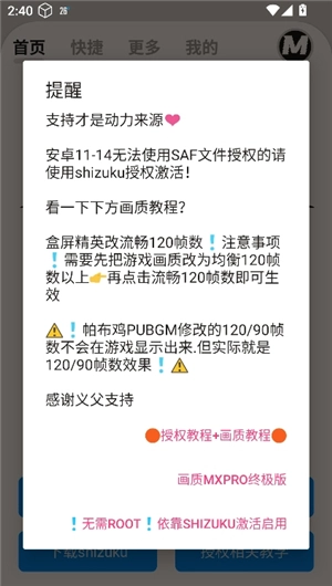 1、于本页面找到画质mxpro与和平精英,完成安装后打开,挑选一种适宜的授权方式,例如shizuku(点击操作)