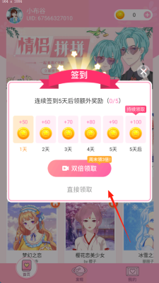 1、进入签到界面,点击直接领取或看视频双倍领取,积累连续签到获奖励。