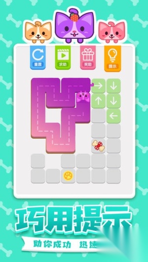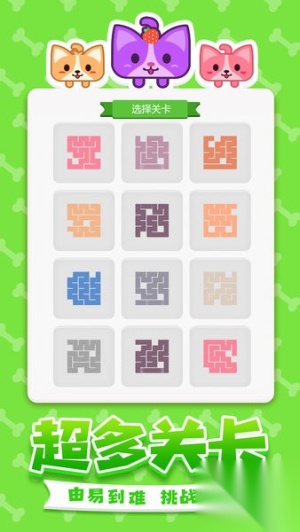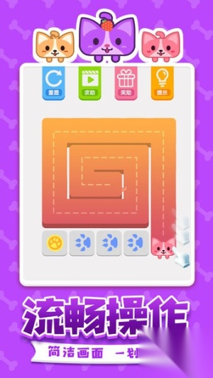 1. 基础玩法为:通过手指在屏幕上进行画线操作,指引汪星人以一笔的方式连接所有格子,在此过程中,既不能重复已走过的路径,线条也不能出现中断的情况。
