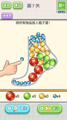 脑子不太够这款游戏的挑战任务非常烧脑,玩家在里面需要冷静思考,利用自己的智慧和创造力解决游戏中的每个难题,遇到任何困难都不要退缩,一定要想办法将物品都装到瓶子中,每一个道具你都可以使用,帮你解锁更多的游戏任务。