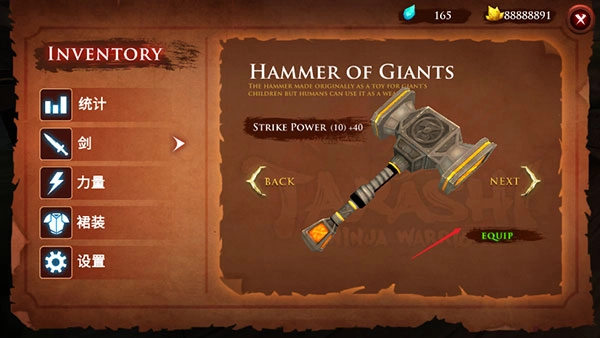 4、轻点右上角的暂停菜单,随即能够查看剑、力量、裙装配饰的详细说明,点击“EQUIP”,就能换上全新武器与裙装。
