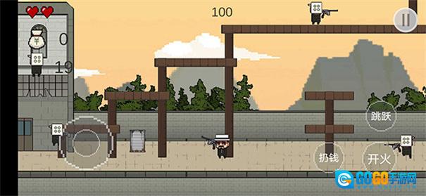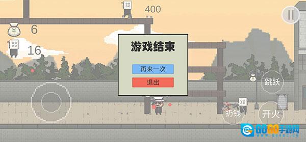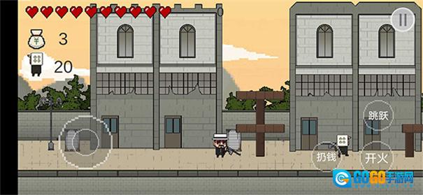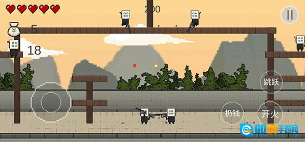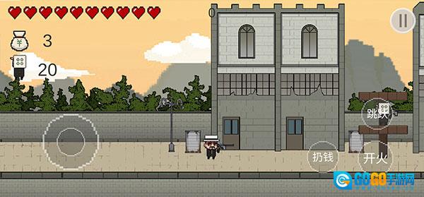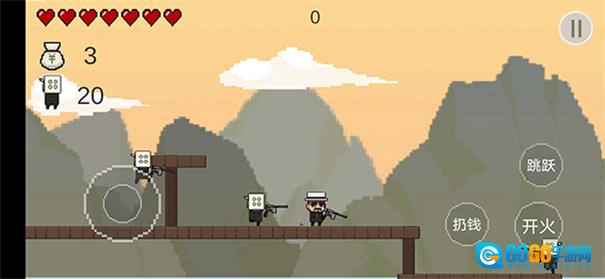 3、以单摇杆来说,小编点击进入后,发现左下角是控制轮盘,右侧依次排列着跳跃、开火以及扔钱按钮,而左上角则显示着当前生命值、已获得的钱袋数量,还有当前关卡中的敌人情况。