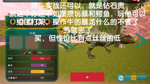 异特龙:实战表现还行,就是价格太贵,钻石消耗大。与其这样,不如攒攒资源去玩暴龙和鳄鱼。玩这俩可以组团作战,要是操作厉害,暴龙之类的就尽管秀,直接买就行。不过异特龙的性价比稍微有点低。