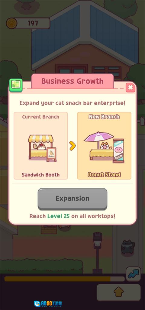 8、当工作台达到25级之后便可拓展您的猫咪小吃店事业,比如开分店,或者开甜甜圈店,之后就需要玩家自己慢慢探索啦。