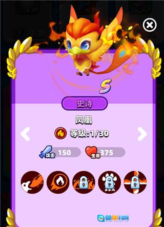 凤凰的初始技能为火焰吐息:每回合开始时,对1名敌人造成伤害,并附加灼烧效果,冷却时间为4回合。其二技能是在游戏开始时,获得一个火焰球。