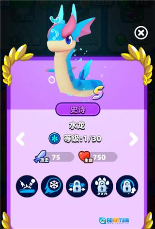 水龙的主技能为冰墙:每回合开始之际,会于底线的随机位置生成2格冰墙(该冰墙具备弹回球的能力),技能冷却时间为5回合。其第二个技能同样是冰冻球:游戏开启时,即可获得一个冰冻球。当水龙升级到传说品质,将解锁强化冰墙效果:冰墙长度得到增加;升级至荣耀品质,解锁强效祝福效果:所有上阵宠物的属性提升35% ;而升级到永恒品质时,会解锁持久冰墙效果:冰墙在场的时间延长至10秒。