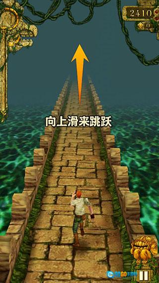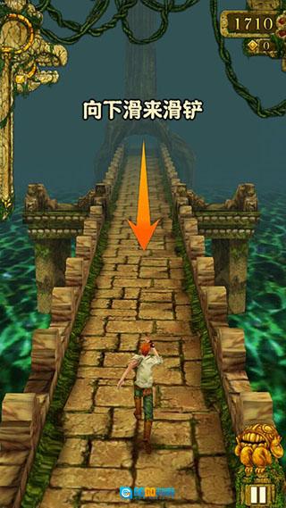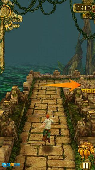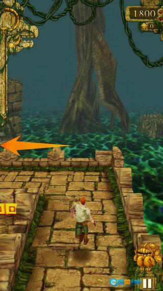 1、主动撞墙。此方法操作简便,参照上图,确认前方没有障碍物时,滑动手指让角色撞击墙壁,这时怪物会出现,角色速度也会随之降低。待怪物消失后,可重复此操作。 需要留意的是,无论以何种方式被绊倒,都会有一段“无反应时期”。也就是说,当前方存在障碍物时,不能采用这种方法(下面2、3的方法也是如此)。在主动撞墙之后,马上点击跳跃是不会有反应的,只能看着角色掉落下去。