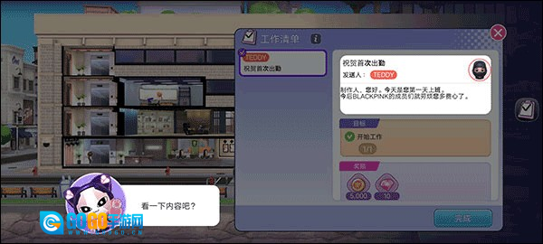 3、游戏里,世界回到了BLACKPINK尚未出道之时。点击“信封”,开启你的首份工作。你的好伙伴Teddy会发来出勤祝贺,顺利完成工作能收获丰厚奖励,点击“完成”就能领取奖励。