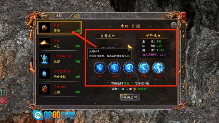 3、玩家击杀各类首领BOSS时,有一定几率掉落1 - 3阶的低阶盾牌。玩家可通过收集盾牌残片来合成高阶盾牌。盾牌合成规则如下:合成一阶盾牌,直接花费10个盾牌残片即可;而合成其余高级盾牌,需消耗2个同级盾牌,才能合出高一级的盾牌。盾牌合成需满足指定等级,并且合成盾牌要耗费大量元宝,盾牌级别越高,所需元宝越多。