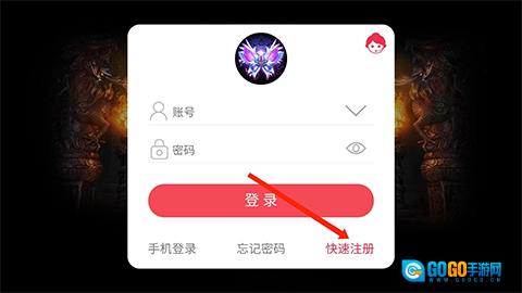1、开启传奇霸主,点击右下角的“快速注册”选项,填入账号与密码,从而完成注册。
