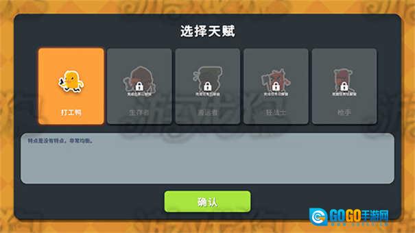 2、接下来选择天赋,在《逃离鸭科夫》中设有打工鸭、生存者、搬运者、狂战士和枪手这五种天赋。新手进入游戏时仅能选择打工鸭,选好后点击确认。