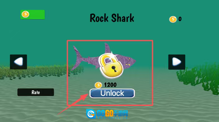 3、点击蓝色的“Unlock”按钮,花费1200金币,即可解锁被锁定的Rock Shark鲨鱼。